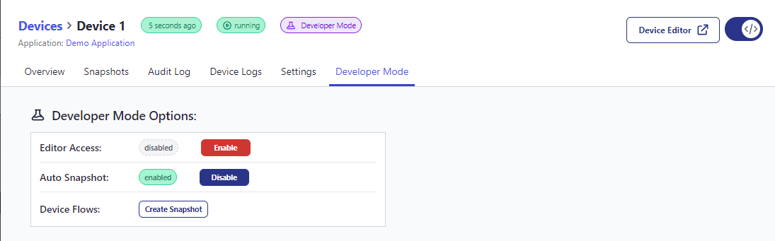 • Developer Mode: Blocks any new Target Snapshots running, but allows for remote editing on the Device.